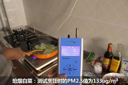 制作炝熘白菜时,厨房的PM2.5为133ug/m3,油烟中的颗粒物含量还算过得去。