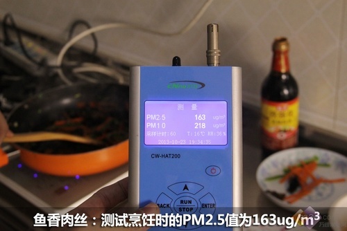 制作鱼香肉丝的过程中,在油烟起来的时候测试PM2.5的值为163ug/m3,当然这个值已经超过了我国规定的75微克/立方米的安全值,不过比起北京大气污染中的PM2.5的含量来说,只能说是还算可以。