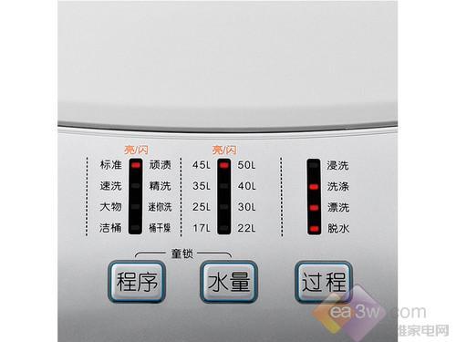 在控制面板方面,本款洗衣机有程序选择、水量选择、过程选择等多个按键。其中,程序选择按键中有八种洗涤程序可供选择,包括常用的标准洗、强力去污的顽渍洗、节省时间的速洗、针对小物件的迷你洗、避免2次污染的筒清洁等。