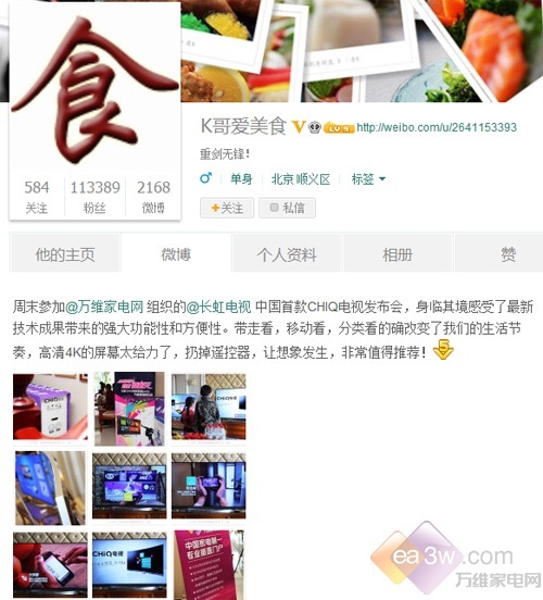 喜欢美食、摄影、音响、和一切高科技产品的新浪微博白金达人“我想说真话”终于学会了如何将平时拍摄的美食、旅游、高科技产品照片与好朋友在家一起分享了,因为他参加了3月1日由万维家电网举办的长虹CHiQ电视品鉴Party。