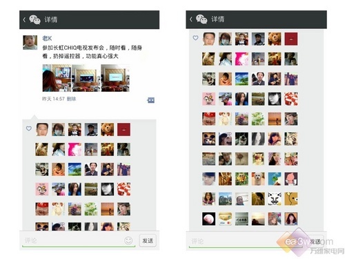 你身边有“吃饭先拍照”的朋友吗?你喜欢将身边有趣、好看、精彩的场面的场面都拍下来吗?…拍下来之后呢?当然一定有很强的分享欲望,不过此时手机屏幕 未免就太小了。而长虹CHiQ电视却可以跨界与智能手机/PAD分享,达人“我想说真话”体验之后感叹到:“我手机上的精彩内容终于可以和朋友一起在大屏 幕上分享了,试了一下,没想到视频也可以推送过去,太给力了。”