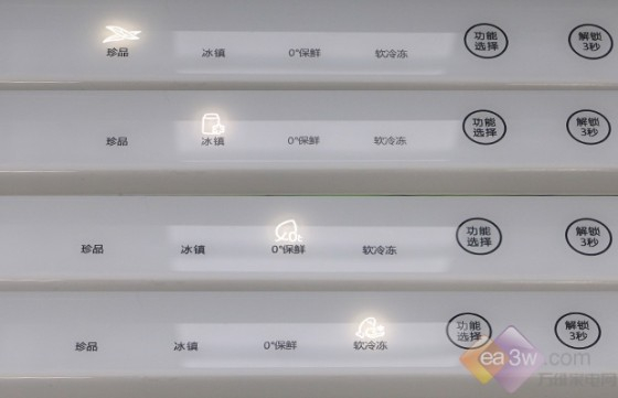 (从下图来看)该变温技术从1、珍品模式、2、冰镇模式、3、零度保鲜,4、软冷冻模式等进行自由调节,实现不同食物有不同储藏条件。