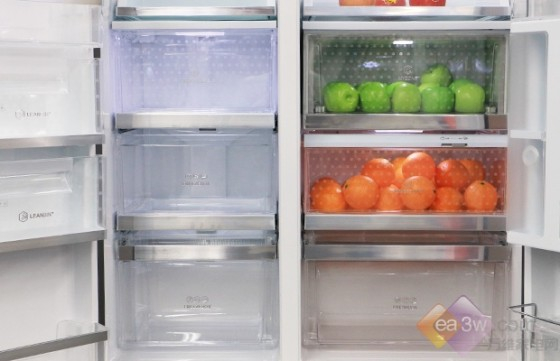对比冷藏室/冷冻室空间格局,拥有超大容量的空间被分配出多个大容积抽屉。在满足用户储藏需求同时,尽可能将不同食物分类存放。透明的内饰设计,食物保鲜状态一目了然。