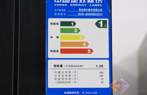 该款冰箱采用智能控制变频压缩机,严苛追求风路及制冷管的无阻力流线,更配以毛细管的多级喷发,这款800升大容积冰箱额定噪音值仅为36分贝,行业内最静音的大容量冰箱。这款冰箱能效等级为一级,耗电量为1.38度/天。