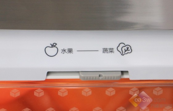 除此之外,在果蔬盒还设有湿度调节钮,针对水果、蔬菜两种食物进行不同湿度设定,更利于食物的保鲜。