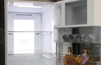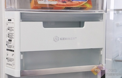 在冰箱冷冻室门体上,设有壁挂式制冰机,在很多高端冰箱中都采用移动式制冰机或安装于冷冻室内,该冰箱设置于门体中间,倒流盘设计在行业中也是唯一的。