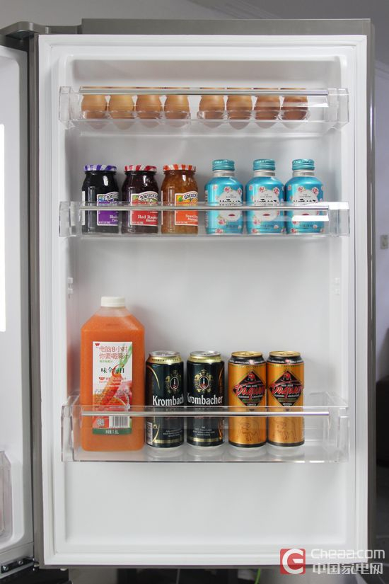 冰箱冷藏室门胆内侧的空间也被很好地利用起来。上下搁架之间的距离非常宽松,用户可随意放置各种高度不同的调味瓶或饮料等,拿取十分方便。