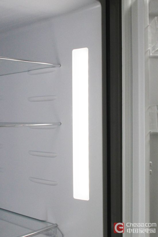 冷藏室内,左右两侧的塔式LED长灯带设计,光线柔和温馨,冷光光源不会产生任何热量,亦不会使箱内的温度产生波动,照明效果佳,节能又环保。