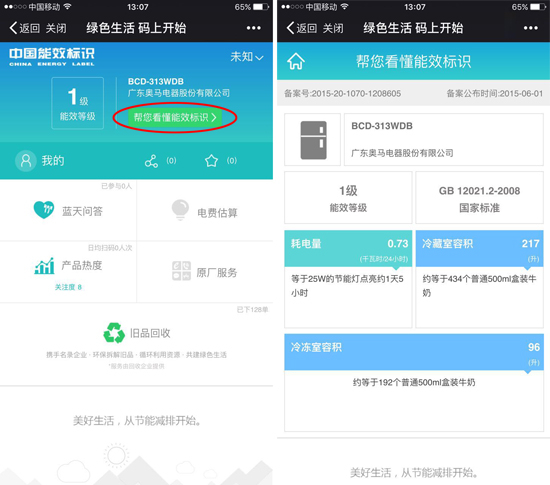 用户通过手机扫描,能够查看到所购买的奥马BCD-313WDB冰箱能效、国家标准、耗电量、冷藏室冷冻室容积等具体参数。此外,更有奥马贴心为用户设置的蓝天问答、电费估算、产品热度、原厂服务、旧品回收等一系列便民应用。