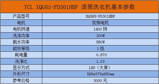 TCL XQG85-FD301HBP 滚筒洗衣机以银灰为主色调,机身尺寸为595x575x850mm,完美的机身比例更符合东方女性的使用习惯,衣物取放无需弯腰。运用优雅的几何图案和极简的弧线线条,采用简洁大方的外观设计语言,精工细凿,让洗衣机外观线条完美过过渡,与机身前面板弧线设计共同构成了洗衣机外观流线,打造专属R30完美圆角。这款产品的洗涤/脱水容积为8.5kg,可满足大多数家庭的日常洗涤需求。