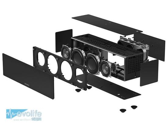 在机身背面还配备一个被动振膜,增强低音效果。另外还留有两个螺丝孔,方便安置在墙壁上。它还配备有电源、3.5mm音频输入、标准USB、LAN、HDMI ARC、USB-B接口,也支持802.11 a/b/g/n无线网络以及DLNA、LDAC传输技术。