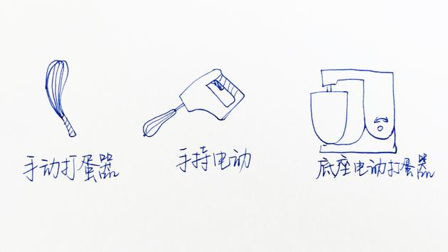 在这里着重讲一下打蛋器,打蛋器分为手动和电动的两种,而电动的又分为手持和带底座的两种。具体如下图: