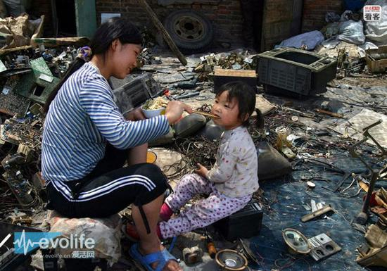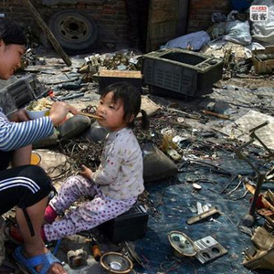 中国广东清远,在过去的40年里,作为行业链条的最低端,承接了无数的非法电子垃圾处理,当地工人以手工拆解,分离重金属,就地焚烧塑料;汕头贵屿镇,曾聚集2000多家电子垃圾拆解作坊,当地90%的儿童受到重金属污染;菲律宾马尼拉贫民窟里,小孩子从废旧的设备中分拣铜质部件,赚取每天20块的报酬;尼日利亚的电脑废料被燃烧后倾倒入运河,拾荒者在当地团伙头目的组织下,在污水与火光中抢拾。