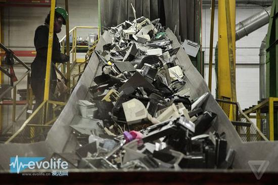 在厂房里,工人们将笔记本一切两半,粉碎显示屏,拆碎键盘和主机。他们将拆卸下来的回路板和碎塑料放在脚边,手下的传送带有滚过下一个,残暴程度,可以作为狂躁症患者发泄情绪的首选地。在交错的传送带后面,是三层楼高,由输送带、当筛机和分拣器组成的粉碎机。金属和塑料被锤开、打碎直到成为雾化成为粉末。然后成为粉尘的电子垃圾还要经过金属探测和鹰眼安全识别。与此同时,边上的一群中年男人又拆开了电脑,取出硬件,将剩下的部分送到粉碎机里。