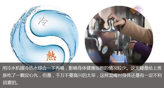 也就是说,用冷水机接冷热水综合一下再喝,影响身体健康指数的情况较少。这无疑是给上班族吃了一颗定心丸,但是,千万不要高兴的太早,这样混喝对身体还是有一定不利因素的。