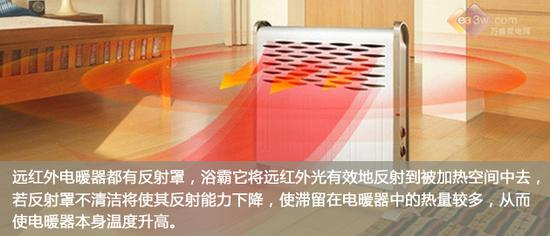 远红外电暖器都有反射罩,浴霸它将远红外光有效地反射到被加热空间中去,若反射罩不清洁将使其反射能力下降,使滞留在电暖器中的热量较多,从而使电暖器本身温度升高。因此保证反射罩的光亮清沽,是降低电暖器本身温升的有效方法。除此之外,与反射罩的设计、安装合理与否也有一定关系。