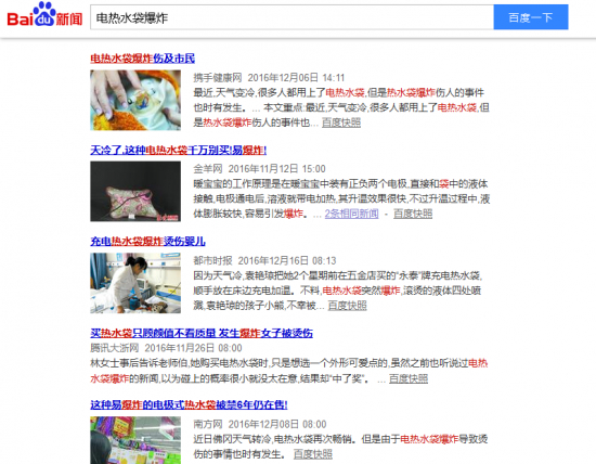 虽然这些小东西能给我们带来些许温暖,但却频频酿成祸端。我们经常能够从新闻里看到因为使用某些取暖设备被烫伤或触电。而且市场上这些产品质量参差不齐,在使用时会存在很多安全隐患。在这些产品当中,电热水袋无疑是最具危险性的代表之一。通过搜索引擎搜索“电热水袋爆炸”这几个关键字,我们可以看到好多的“惨剧”出现……