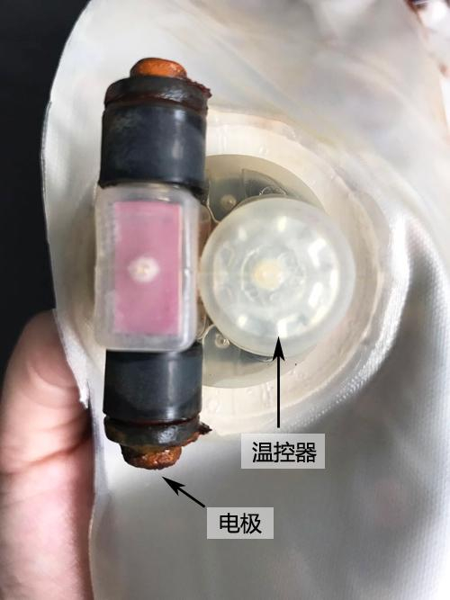 可以看到这个电热水袋是一个很明显的电极式热水袋,它的核“芯”也非常简单。就是一个电极+一个温控器。这里给大家科普一下温控器的作用,电热水袋之所以能够自动断电,全都靠这个温控器。当温度加热到预设温度时,电热水袋就会自动断电。所以,如果这个简陋的小部件坏掉的话,后果可想而知……