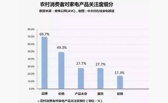 在农村,人们以前考虑的是家电产品的价格,价格便宜的家电更受人们的欢迎,会成为当时最为热销的家电产品。但如今的农村家电消费标准却发生了改变,价格虽然也会影响人们消费,却已经不是其中最为主要的因素,占各个因素的49.3%;家电品牌得到了69.7%的消费者关注;而产品本身只得到消费者27.7%的关注度。