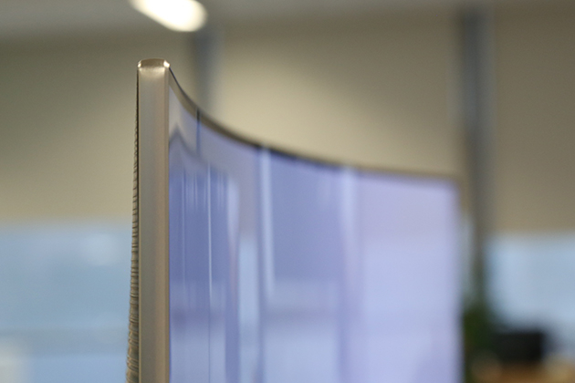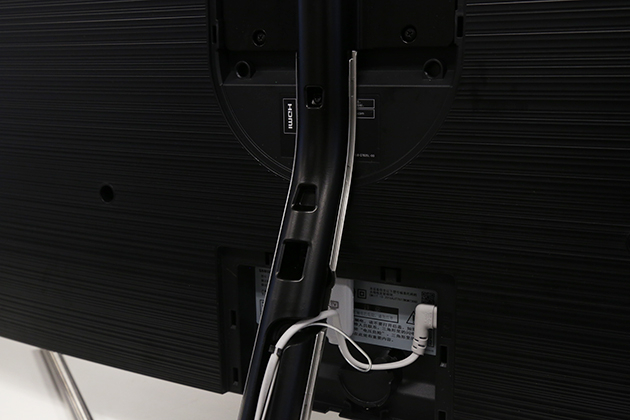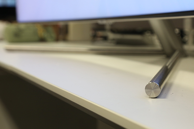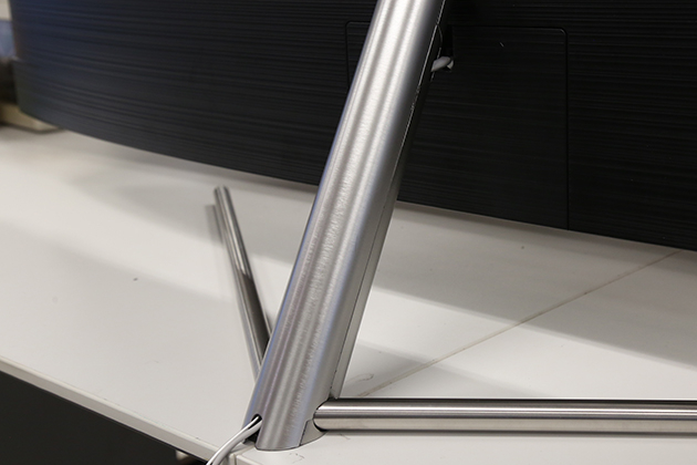与Q8C第一个明显的差别在于电视底座,虽然这款产品依旧采用给人“浮空”视觉效果的支架,但却把与曲面屏幕呼应的弧形脚架替换为Y字形。不过金属材质倒是得以保留。