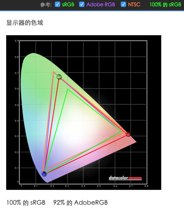 上图可见,屏幕色域可达到100% sRGB、92% AdobeRGB,在蓝色和红色部分,甚至超过了sRGB、AdobeRGB和NTSC色域。