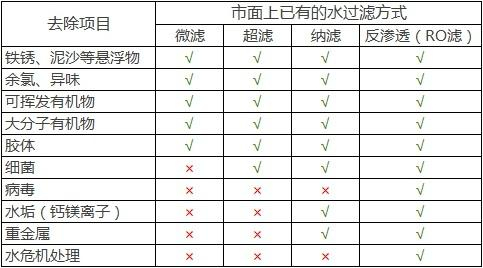 我们市场上常见的净水器,水过滤的方式无外乎这几种:微滤、超滤、纳滤和RO反渗透,关于这几种方式的过滤能力,如表所示。