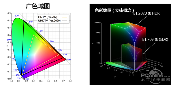 从理论上来看,所有定制颜色编码的方法,无论是BT.709、SDR、HDR,都需要用色域空间×亮度范围,才能变成一个立体的概念,更高亮度宽容度的HDR的显示设备,才能把更极端亮度下的颜色和细节展现清晰。