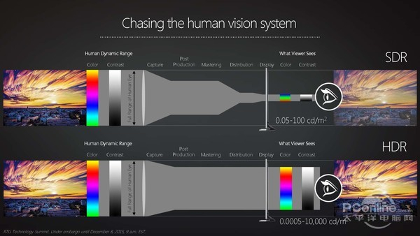 某些高端摄像机可以将10^5cd/m²亮度记录下来,高端的显示设备也能还原出这个亮度,但是视频格式的记录和传输,还是沿用了50年前的SDR的标准,最大只能承载到10^3cd/m²。无法满足人眼视觉系统对于环境光线感知的需求。