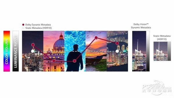 或许你会质疑亮度那么高有什么用,亮瞎眼?然而事实是,亮度和色彩是不可分割的孪生兄弟,它们之间共同构成了一个新的概念“显色体积”。当亮度动态范围和色彩相结合时,就会形成立体的色彩空间。这个立体色彩空间就可称之为“显色体积”,它意味着视频格式能带来多大的色彩数量。如果离开亮度谈色彩,就会变成伪命题。