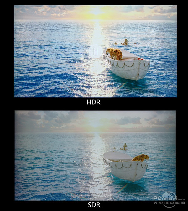 从这张《少年派的奇幻漂流》的屏摄图中可以看到,HDR整体的亮度就要高SDR一截,亮度层次更加丰富,也让对应的颜色更加丰富准确。所以HDR的整个画面看上去通透不少,SDR像蒙上一层面纱。