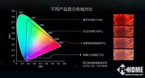 NTSC色域是指在NTSC标准下的色彩总和,色域值越高,色彩表现力越好。也正是如此目前高端电视不断尝试提升色域值。目前液晶电视主要提升色域指标的手段有采用使用广色域背光组件,其中包括量子点、改良型KFS荧光体组件等。