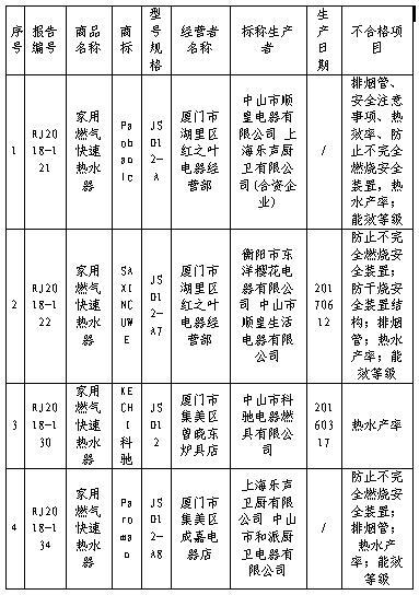 2018年流通领域家用燃气快速热水器商品质量抽查检验不合格名单