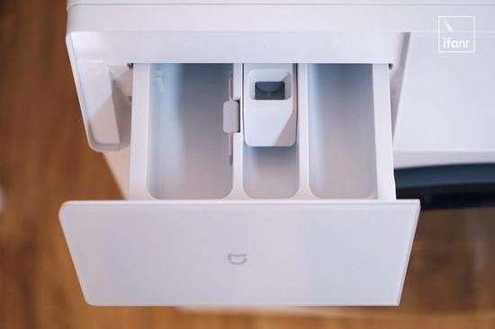 米家洗烘一体机的洗涤剂盒和大多数滚筒洗衣机一样在左上角,在洗涤剂盒的外面还有米家标志 Logo,也是这台洗烘一体机上位数不多米家标志性的元素。其实从外观看这台洗烘一体机并不非常像米家设计的产品,它要更像传统的白电设计一点,在使用上也不像米家其它的产品那么依赖互联网。