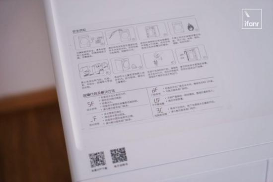 在洗衣机上还贴有安全须知,如果追求整个机身的一体化可以把这个撕掉,不过最好还是先仔细看看,上面有一些注意事项以及故障代码和解决方法。此外机身上还印有两个二维码,分别是米家 app 下载和电子说明书的二维码,如果想尝试远程控制的话可以将其加入米家 app 中。