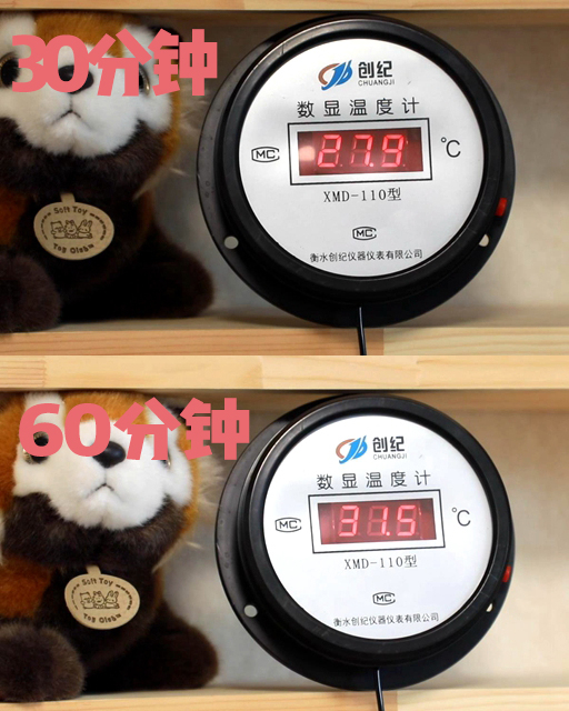 同样,空调制热开启一小时后温度室温为25.7度,出风口温度变化不大,但较小屋室温更低一些;电暖器30分钟后,室内温度24.2度,出风口温度接近100度,而一小时后室内温度分别为25.1度。