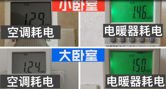 那耗电又如何呢?1小时后,空调与电暖器耗电分别为小屋1.29度,1.46度以及大屋1.24度以及1.5度。电暖器比空调耗电量更多一些。