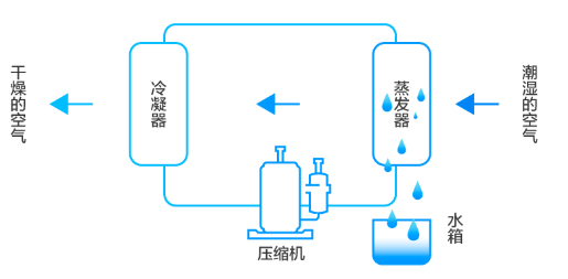 另外一种就是通过冷却或者加热空气进行除湿,比如空调跟冷却型除湿机,都是用压缩机压缩制冷剂,湿热的空气被抽进机器接触低温冷凝片,发生冷凝反应,凝成小水珠,进入水箱,最后机器再将干燥的空气排出。