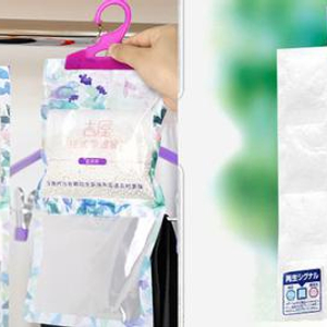 另外一种除湿袋是硅胶的,性能稳定,物理除湿,可以重复利用,吸水后晒干又是一条好干燥剂。它的优点除了可重复利用,还有就是轻薄,平着放竖着放都可以,不用担心像氯化钙除湿袋一样,水集满了会掉下来洒得到处都是。缺点呢,也跟氯化钙除湿袋一样,体积小。