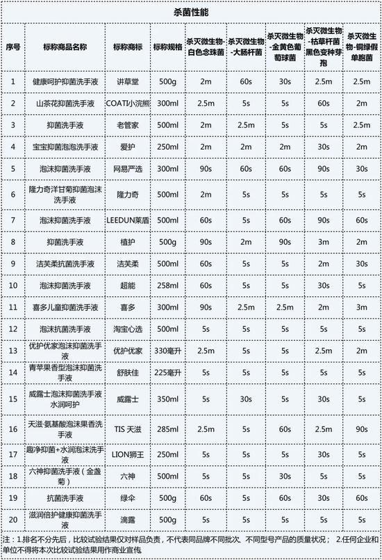 检测结果显示,杀菌性能上,20款样品均能杀灭规定的菌落数量,但杀菌速度差异明显,其中淘宝心选、滴露、舒肤佳杀菌最快,能在5秒内迅速杀菌。