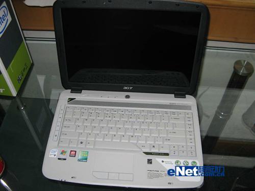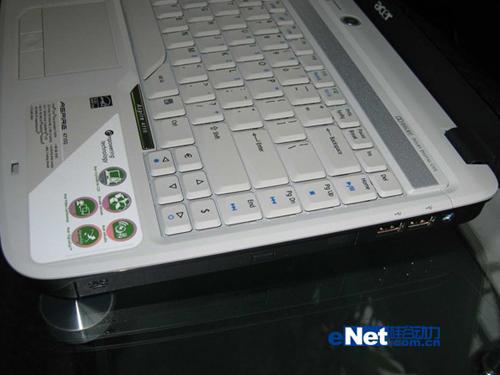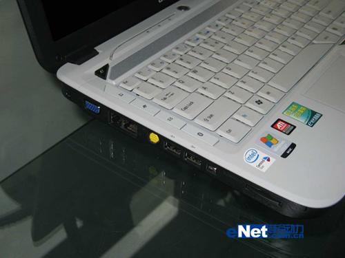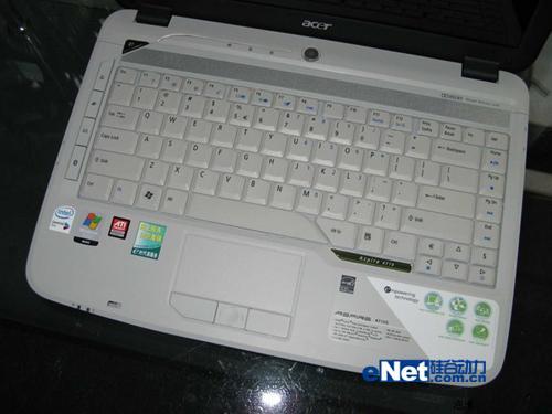 宏基AS4710G外观设计方面依然采用了宝石的外形设计,平滑的线条设计配合白色的键盘,首先在视觉上就令人满意。该机机身尺寸为344×246×37.42mm,机体重量为2.68Kg,就同档次机型来说,便携性还比较不错。