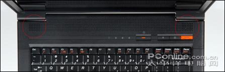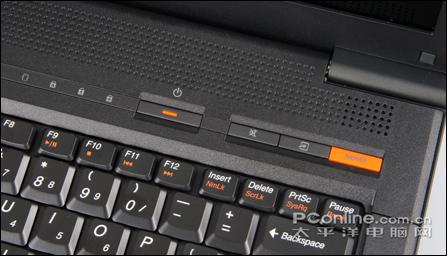 联想C466的三个功能键位于键盘右上方,分别是静音、菜单及NOVO键。橙色的NOVO键还是非常抢眼,可以实现一键恢复和不进系统一键杀毒。另外键盘上有些字母也是橙色的,加上NOVO键的橙色设计,对于纯黑色的外观起到了较好的点缀作用。