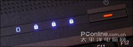 常用几个指示灯的都在键盘上方,分别是硬盘状态、大写字母锁定、数字键锁定以及滚动条锁定,这一点设计还是比较人性化的。其它几个状态指示灯电源、充电状态以及无线(不可用)在左腕托前端,在操作键盘的时候会被遮住,但不是很常用也就不碍事了。