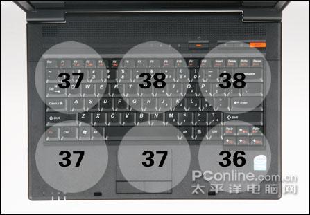 在散热方面联想C466表现得相当不错,尤其需要称赞的是其硬盘不像一般笔记本那样放置在左右腕托背后的位置,因此能够很好地保证左右腕托舒适的温度。在实际使用中我们也发现联想C466左右腕托位置的温度控制很好,具有很好的使用舒适性。虽然内存发热量很大,但是在靠近触摸板位置的温度还是比较适宜的。