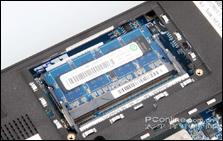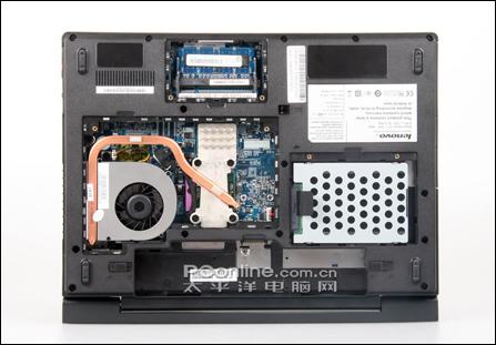 我们可以看到内存位置、无线网卡(此款机没有无线网卡配备)位置和散热风扇位置均有散热进风口的设计。散热系统工作很到位,经过长时间的高强度的使用,整机的发热情况都不会很明显,键盘位置有点升高,但并不太影响使用舒适性。总的说来,散热还是令人满意的。