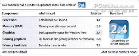 VISTA自检测试中,最低分果然出现在桌面图形,一方面由于是采用GL960芯片组,令集成显卡主频降低;另一方面512MB内存也限制了显存的进一步提高。2.4的得分运行VISTA显得有点吃力,多任务大程序运行的话会出现反应迟钝等现象。硬盘成绩达到5.1分,十分不错。