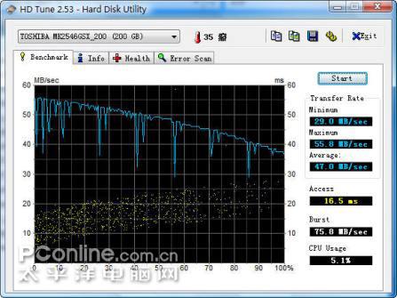 在磁盘测试中,传输曲线下降的幅度不是很大,说明磁盘性能比较平稳。而16.5的寻道时间与75.8MB每秒的读盘速率也在中游水平。