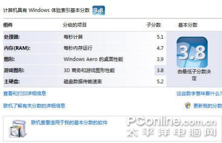 VISTA的体验测试中CPU的分数同样让人眼前一亮,分数冲破5的大关在T5系列中十分难得,而基本分数为3.8,性能的瓶颈不出意料地出自显卡上,具体是游戏图形方面,而显卡的两项分数没能冲破4,说明性能上还是与G86与HD2400系列有一定差距了。