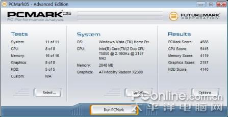 在PCMark05测试中,4588的分数算是比较高了,毫无疑问这个分数是由处理器5445的分数所带动的。同时在这里我们也可以看到,2137的显卡得分显然不能让我们满意,要知道,普通X3100集成显卡的平均得分都可以去到1600分左右。X2300独显并未能与集显拉开太大距离,只能用强差人意来形容,让人感到甚是遗憾。