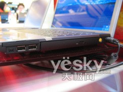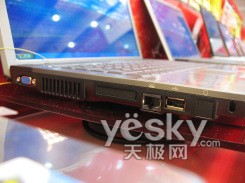 接口方面,它拥有3个USB2.0接口,1个IEEE1394,VGA接口、声音输入、声音输出孔(支持SPDIF),RJ11、RJ45。除此以外它还配备了1个直流电源插孔,1个安全锁孔,1个Express卡和4合1读卡器(SD/MMC/MS/MS Pro)。
