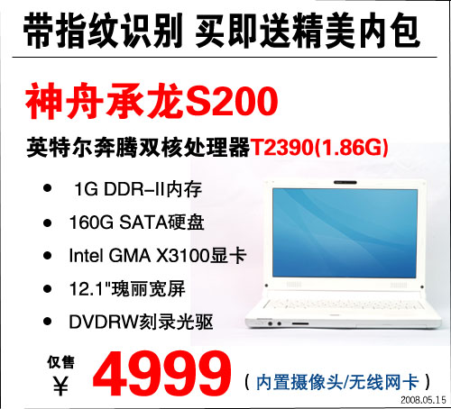 神舟承龙系列商务笔记本电脑的推出,以其无可挑剔的高品质、高性价比,为中小企业和个人商务办公市场注入了一股新的活力。而其中12寸瑰丽宽屏的承龙S200更以其洁白的外衣和轻盈的体态,引领着时尚商务潮流,仅4999元的价格也让你再一次领略到神舟亲民的作风。